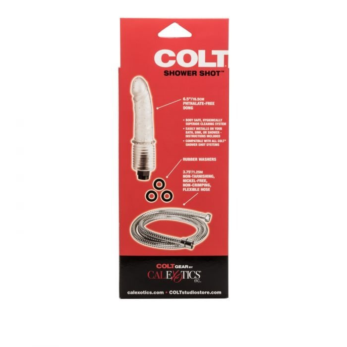 CalExotics COLT Shower Shot je intimní sprcha určená pro důkladné a pohodlné proplachování. Součástí balení je anatomicky tvarovaný nástavec a flexibilní hadice, které umožňují použití jak pro anální, tak vaginální hygienu. Nástavec je vyroben z kvalitního PVC a kovové části z odolné chromované oceli, což zajišťuje snadné čištění a dlouhou životnost. Tento hygienický doplněk je kompatibilní s běžnými koupelnovými bateriemi a poskytuje kontrolovaný, příjemný proud vody. Více informací