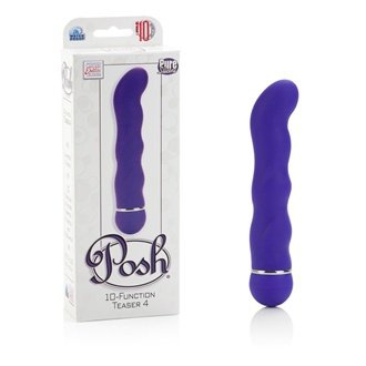 Vibrátor Posh ® 10 - Function Teaser 4 – Purple je vyroben z kvalitního jemného silikonu. Silikon je ten nejlepší materiál pro velmi citlivé ženy, je naprosto hypoalergenní a perfektně se udržuje. Vibrátor z nové kolekce výrobků California Exotics Novelties v sobě kombinuje jak zajímavý tvar pro zvýšení požitku z jeho použití, tak i výkonný motor, který disponuje deseti druhy vibrací, pulsací a eskalací. Jeho tvar je předurčen k naprosto univerzálnímu použití a to jak na klitoris, tak na vaginální stimulaci s jemným zakřivením na bod G, tak i jako anální vibrátor na masáž prostaty. Na spodní straně vibrátoru je ovládání, které je podsvíceno led světlem a blikáním ukazuje rytmus právě probíhající vibrace. Pokud jej chcete kdykoliv vypnout, stačí tři vteřiny podržet. Jeho dokonale bezešvé zpracování je perfektní na údržbu.